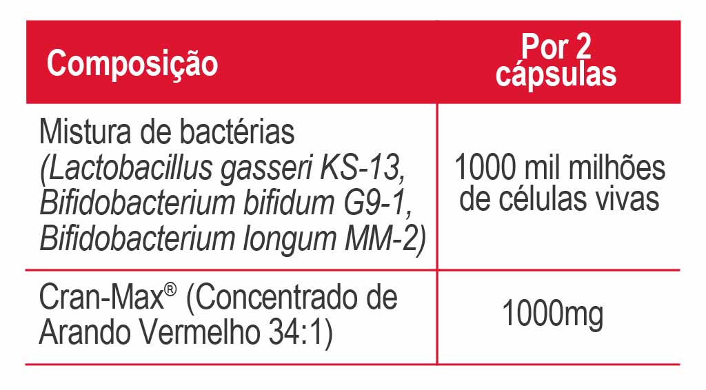 • Mistura de bactérias (Lactobacillus gasseri KS-13, Bifidobacterium bifidum G9-1, Bifidobacterium longum MM-2)- 1000 milhões células vivas.