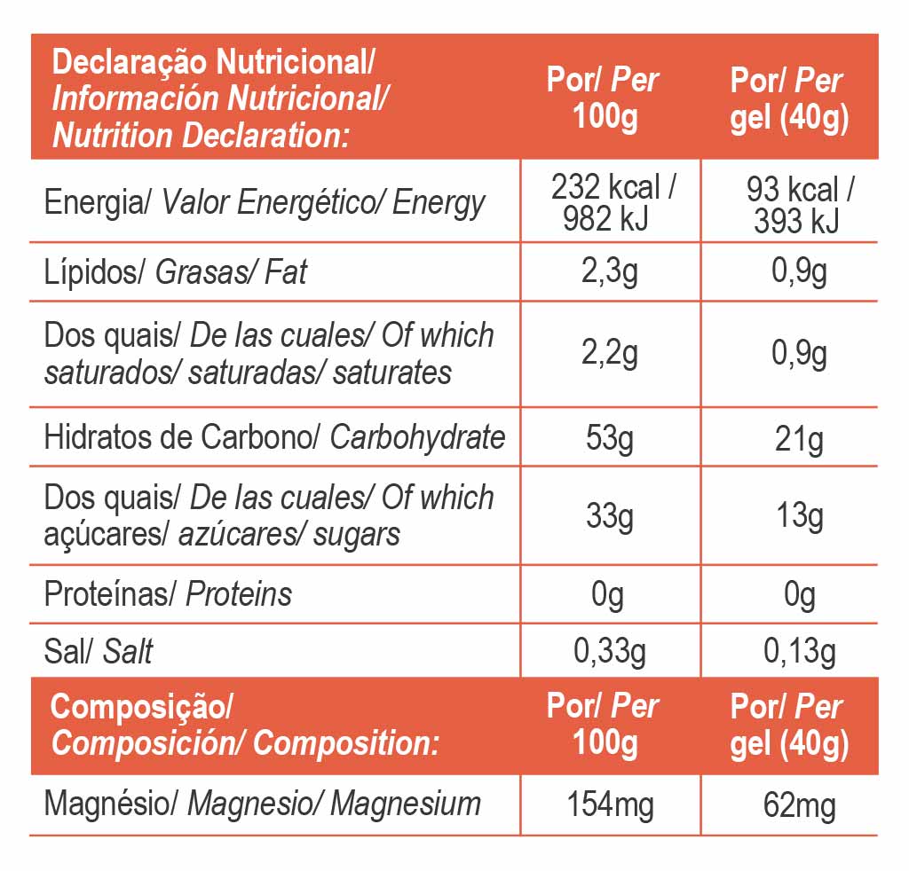 Consumir 1 gel por hora de exercício de endurance; é imprescindível beber no mínimo 250 ml de água por cada gel consumido.