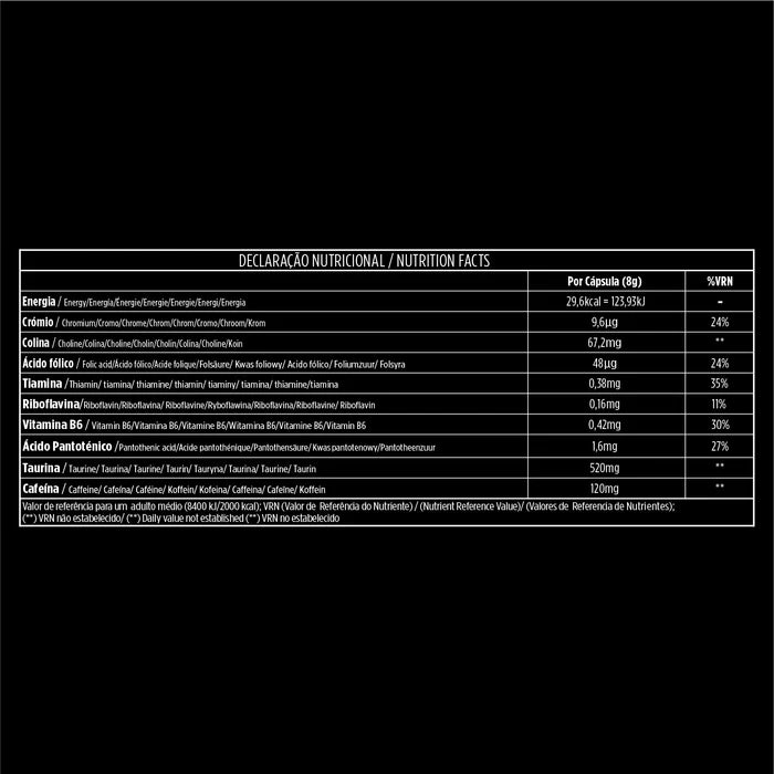 Triglicerídeos de cadeia média (TCM), leite de coco em pó, café solúvel, Isomaltulose* (Palatinose™), taurina, cacau em pó, bicarbonato de sódio, espessante goma de guar, antiaglomerante dióxido de silício, cafeína microencapsulada, cloreto de colina, espessante goma de acácia, aroma, edulcorante glicósidos de esteviol, D-pantotenato de cálcio (acido pantoténico), cloridrato de tiamina (Vitamina B1), cloridrato de piridoxina (Vitamina B6), riboflavina (Vitamina B2), picolinato de crómio, L-metilfolato de cálcio (ácido fólico). *Isomaltulose é uma fonte de glucose e frutose. Antes de abrir e após aberto, manter este produto bem fechado, em local seco e ao abrigo de calor e humidade.