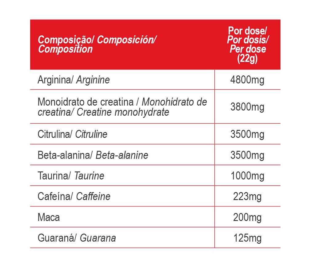 L-arginina, Monohidrato de creatina, L-citrulina, Beta-alanina, Acidificante: Ácido cítrico, Taurina, Aroma, Corante em pó de extrato de beterraba, Cafeína anidra, Pó de raiz de maca (Lepidium meyenni, raiz), Extrato de guaraná (22 % de cafeina) (Sapindaceae Paullinia Cupana K., semente), Edulcorante: sucralose.
