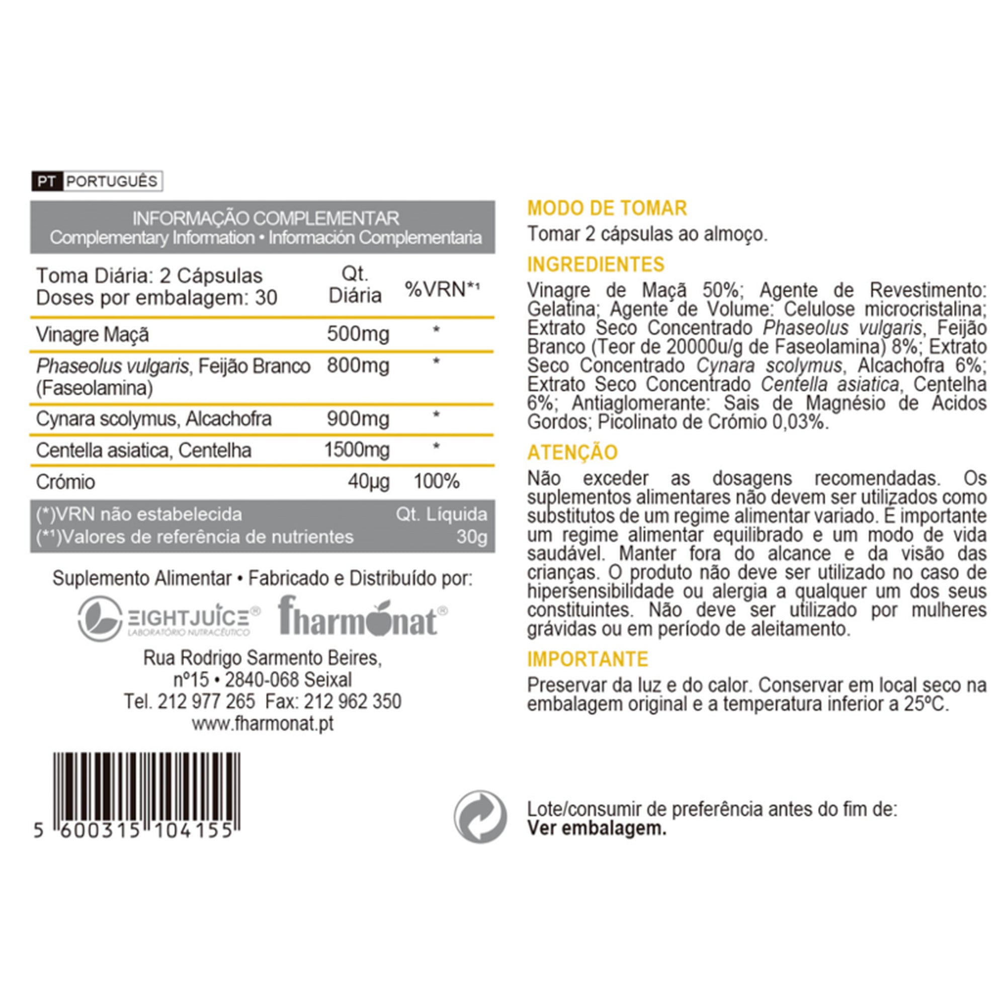 Vinagre de Maçã 50%; Agente de Revestimento: Gelatina; Agente de Volume: Celulose microcristalina; Extrato Seco Concentrado Phaseolus vulgaris, Feijão Branco (Teor de 20000u/g de Faseolamina) 8%; Extrato Seco Concentrado Cynara scolymus, Alcachofra 6%; Extrato Seco Concentrado Centella asiatica, Centelha 6%; Antiaglomerante: Sais de Magnésio de Ácidos Gordos; Picolinato de Crómio 0,03%.
